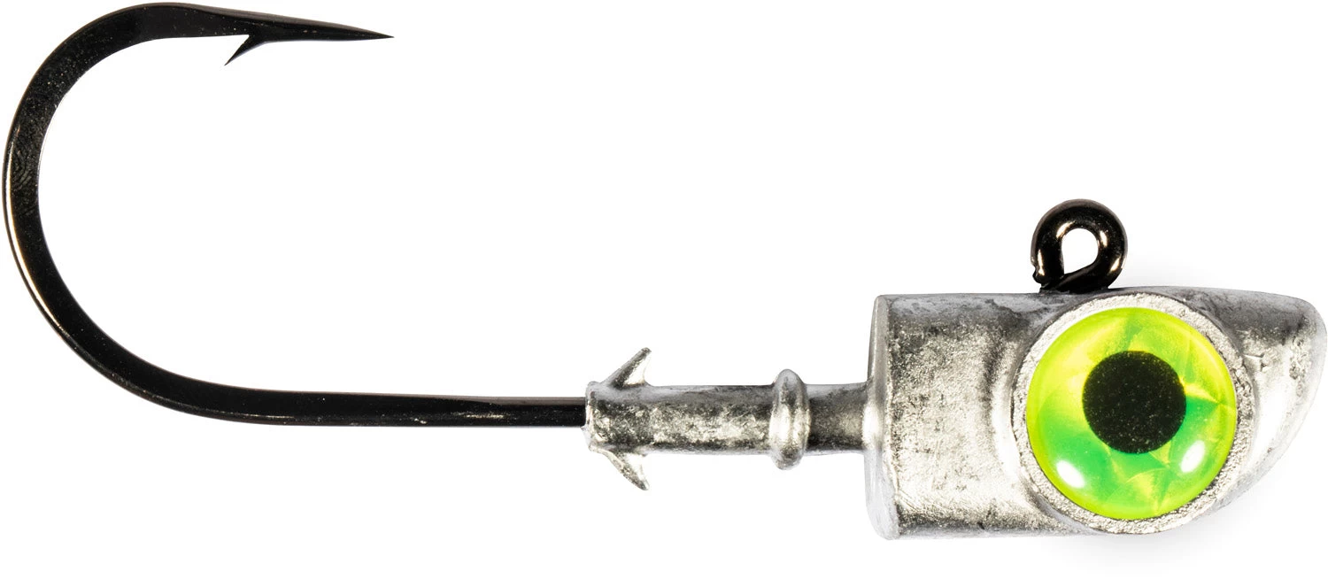 - The Jig Head features oversize eyes to create a prominent strike taget, and dual conical keeper barbs hold your soft plastic securely.